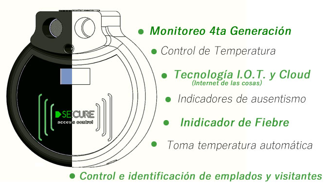 La plataforma SECURE se apoya en un dispositivo electrónico desarrollado bajo nuestra propia tecnología que será ubicado en la entrada del sitio, el cual leerá la tarjeta del funcionario identificandolo, una vez identificado el dispositivo pedirá que se acerque para la captura de temperatura, y posterior registro de ingreso o salida.